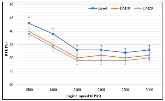 Brake thermal efficiency of the used fuels are presented in Figure 10. The registered values of BTE of all tested fuel showed an increase near the richest conditions (lower speed) and then decreases with increasing engine speeds. BTE presented an average value of the unblended fuel being a little higher than those of blended fuels with increments about 11%. Bearing in mind, BTE values for blended fuels were not far from each other. It is very clear that engine efficiency and BSFC are inversely related and that these values are directly related to the heating value of the used fuels. The reduction in brake thermal efficiency may be related to a greater reduction in cylinder temperature. Increasing premixed methanol leads to a strong reduction in cylinder temperature, which is attributed to the absorption of latent heat from the compressed air, which led to a reduction in crank shaft work. This is due to two factors: (i) fast burning velocity of methanol, and (ii) a huge amount of homogeneity of methanol/air mixture. This attitude will lead to fuel burning through the premixed combustion phase, and it also strongly shortens the combustion period of time [,].