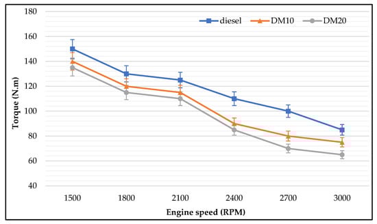 As seen in Figure 11, engine operation under different engine speeds showed that increasing engine speeds led to a decrease of engine load; as expected, the highest torque achieved was 150 N·m at an engine speed of 1500 rpm. By increasing engine speeds to 3000 rpm, torque registered the lowest value which was 85 N·m. On the other hand, by changing to blended fuel, 10% and 20%, torque dropped to lower values in all different engine speeds; this phenomenon is dominated by LHV of diesel blended methanol.