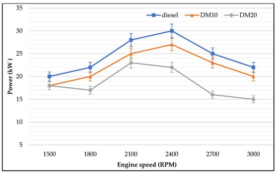 Engine speeds strongly influence the engine BP, Figure 12. When using blended fuel, brake power increased by running the engine with higher speeds.