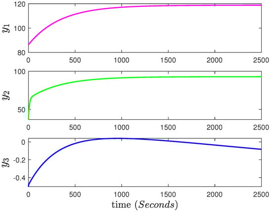 One can calculate several nominal working points based on (1) and (7). In this paper, we consider the case that model (1) represents a 160 MW unit, and the steady-state working points is , , and , as shown in [6]. It represents operation condition. For this working point, the corresponding step-response the non-linear model (1) are plotted in Figure 2.