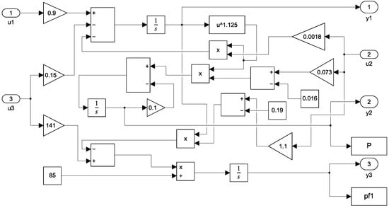 where , , and , respectively, represent drum steam pressure, electric power, and fluid density. , and denote the valve positions for fuel flow, steam control, and feed-water flow, respectively. is the drum water level determined by
