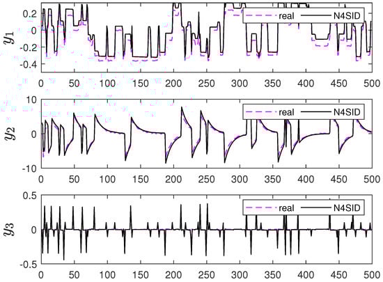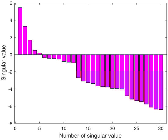 Based on the first 2000 sets input and output data, the N4SID is applied to estimate the system matrix parameters, mainly including the following two steps: (a) constructing a Hankel matrix based on the input and output data, and performing the singular value decomposition (SVD) on the projection of the Hankel matrix to obtain the estimated state sequence; (b) applying the least square method for the estimated state sequence to obtain system matrices . In the identification, the row number of Hankel matrix is set as to obtain the distribution of the singular value histogram, as illustrated in Figure 5. It can be seen that the system information mainly distributes in the first three singular values, which indicates the optimal order of the model as . Therefore, the resulting identified model is