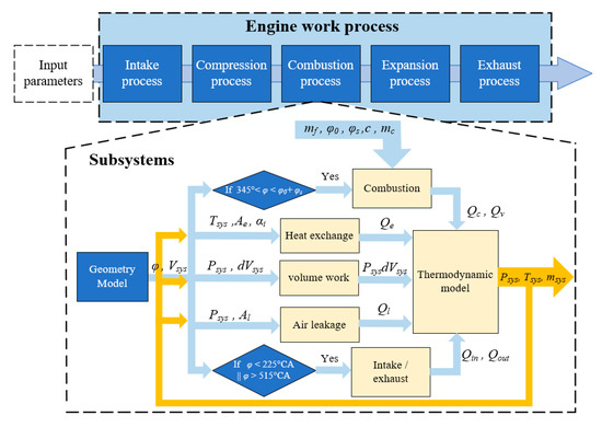 A single-zone model considering the thermodynamic subsystems (leakage, heat exchange, combustion, and volume work) was built using MATLAB/SIMULINK, as shown in Figure 4. The output parameters (in-cylinder temperature, in-cylinder pressure) were re-entered into the subsystems by the feedback mechanism to obtain real-time results.