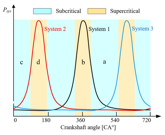 The gas leakage was considered to be an isentropic flow process in which the working fluid in the object system enters the adjacent system through the leakage gap [34], assumed to be a rectangular equivalent hole with an area of Al. Figure 6 shows the relationship between leakage state, pressure, and phase angle. Adjacent systems 1 and 2 are taken as examples, and Table 4 gives the state and calculation equations of leakage flow for two periods, a and b. It is worth noting that the pressure changes of the three systems distributed circumferentially were periodic with a phase difference of 120 [CA°] [39]. Thus, the mass of the object system increased at certain periods, such as periods c and d in Figure 6.