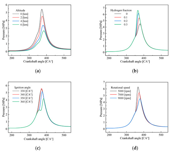 - With the increase in altitude from 0 [km] to 6 [km], the peak pressure dropped from 5.5 [MPa] to 2.7 [MPa]. This problem can be resolved by increasing the hydrogen fraction or decreasing the rotational speed. It is worth noting that at a hydrogen fraction of 0.3, the peak pressure of 6.6 [MPa] appeared at 365 [CA°], which was too late to be favorable for its conversion to mechanical energy.