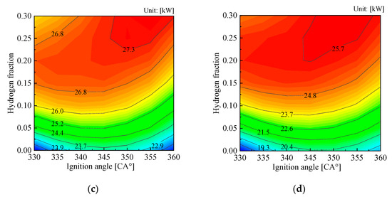 Effects of ignition angle and hydrogen fraction on indicated power at 7000 [rpm]. (a) Altitude: 0 [km]; (b) altitude: 2 [km]; (c) altitude: 4 [km]; (d) altitude: 6 [km].