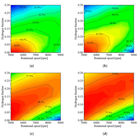 Effects of rotational speed and hydrogen fraction on indicated thermal efficiency at an ignition angle of 345 [CA°]. (a) Altitude: 0 [km]; (b) altitude: 2 [km]; (c) altitude: 4 [km]; (d) altitude: 6 [km].