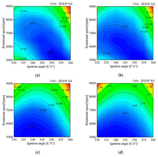 As shown in Figure 13b–d, under high-altitude conditions, the energy conversion efficiency increased at a low rotational speed and small ignition angle and the indicated specific fuel cost improved. However, the indicated specific fuel cost at a high rotational speed remained at a high level. At an altitude of 6 [km], under the condition of an ignition angle of 330 [CA°] and rotational speed of 5000 [rpm], the indicated specific fuel cost was 0.372 [$/(kW·h)], increasing to 0.459 [$/(kW·h)] at 9000 [rpm]. In addition, the adjustment of the ignition angle became particularly important. An early or late ignition was not conducive to the economic performance of the engine. At an altitude of 6 [km], the optimal ignition angle of the engine was between 340–345 [CA°].