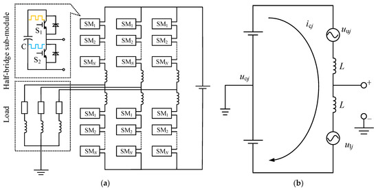The basic topology of an MMC is shown in Figure 1, which contains three phases (A, B and C). Each phase includes an upper arm and a lower arm with N submodules (SM). Figure 1b can be used to represent the equivalent circuit of phase j (j = A, B, C) in the MMC, where L represents the arm inductance, uoj represents the output AC voltage of phase j, icj represents the circulating current of phase j, and all submodules of the upper and lower arms are equivalent to the AC voltage sources uuj and ulj, respectively. Since the submodule of the MMC usually adopts a half-bridge circuit, the submodule involved in this paper adopts a half-bridge circuit structure [28]. As shown by the dashed box in Figure 1a, the driving signals of the two IGBTs (S1 and S2) of the half-bridge submodule are a pair of complementary high-level and low-level signals.