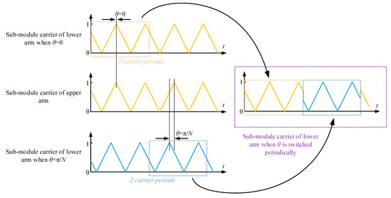 According to Section 2, we know that no matter if θ is 0 or π/N, there is always one harmonic characteristic between the output voltage and the circulating current that is the best and one that is the worst. If we do not want the output voltage or the circulating current to have the worst harmonic characteristics, we can change θ periodically between two fixed values. This is called SDA-based CPS modulation. We can define the switching period of θ as an integer multiple of the period of the carrier, and the multiple is defined as n. In Figure 3, the triangular carrier of a submodule in the lower arm is taken as an example to visually describe the time-domain performance of the carrier when SDA-based CPS modulation is adopted. On the left side of Figure 3, the waveform in the middle represents the carrier of the upper arm’s submodule, and the upper and lower parts of it are the carriers of the lower arm’s submodule when θ = 0 and θ = π/N. The waveform on the right side of Figure 3 is the carrier of the lower arm’s submodule when θ is switched periodically. When the displacement angle is switched periodically, the displacement angle of the first and second periods of the carrier is 0. At the end of the second carrier period, since the displacement angle is switched from 0 to π/N, the lower-arm triangular carrier waveform will quickly advance the original phase by π/N while continuing to maintain two carrier periods, and then the displacement angle will return to 0. The above process will be repeated continuously.