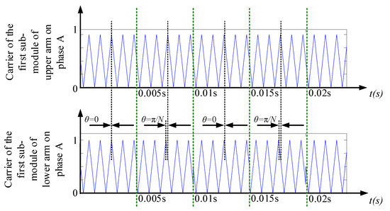 First, the triangular carriers in the above three cases should be generated. Figure 4 shows a comparison diagram of the triangular carrier of the first submodule of the upper arm and the triangular carrier of the first submodule of the lower arm of phase A in the case of SDA-based CPS modulation being adopted, where θ is switched every five triangular carrier periods (n = 5). As can be seen from Figure 4, in the first to fifth carrier periods, θ is 0. At the end of the fifth carrier period, since θ is switched from 0 to π/N, the waveform will be ahead of the original phase by π/N, and will continue to maintain five carrier periods; then, θ will return to 0. This process will be repeated continuously. Compare the carrier wave when θ = 0, θ = π/N and SDA-based CPS modulation is adopted with the reference signal to obtain the switch drive signal of each submodule, and generate the output voltage and the circulating current of phase A in the above three cases, as shown in Figure 5, Figure 6 and Figure 7, respectively.