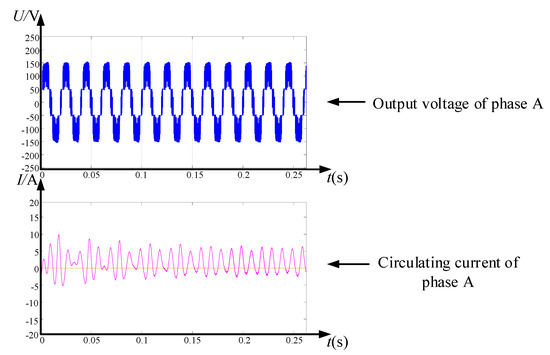 As shown in Figure 5, when the output voltage harmonics are eliminated, the higher-order harmonics of the circulating current are obvious. When the circulating current harmonic is minimized, as shown in Figure 6, the circulating current is significantly smoother, but the output voltage is rougher than that in Figure 5. In Figure 7, the circulating current is obviously characterized by half being smoother and the other half containing more high-order harmonics. The circulating current is smoother when θ = π/N, and has more burrs when θ = 0. In Figure 7, the roughness of the output voltage is between that of Figure 5 and Figure 6.