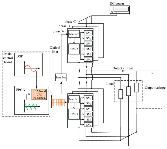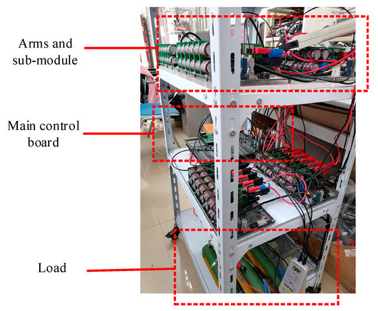 Considering the advantages and disadvantages of DSP and FPGA [32], an MMC experimental platform based on DSP-FPGA is built, and the feasibility of the method described in Section 3 is further verified by using the experimental platform. The main structure of the experimental platform is shown in Figure 9. The left side of Figure 9 is the main control board, which mainly includes DSP and FPGA. In this experiment, DSP is mainly responsible for the generation and adjustment of the reference signal, whereas FPGA is mainly responsible for the generation of carrier and SDA-based CPS modulation. The right side of Figure 9 is the main part of the MMC system, which consists of three phases, including the upper arm and the lower arm. Each arm contains six submodules. The PWM signal generated by the modulation will be transmitted to each arm through optical fiber communication, and then, the CPLD on each arm will analyze the signal and control the six submodules on the arm. The load adopts the star connection method, and the load resistance connected to the output of each phase is 22 Ω. The experiment was conducted under 60 V DC voltage. The MMC experimental prototype is shown in Figure 10.