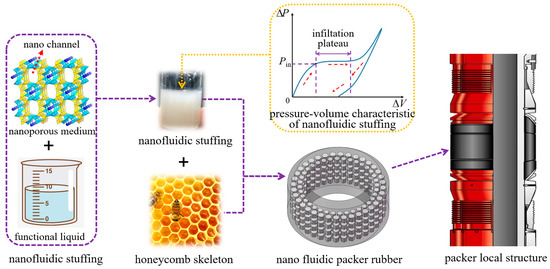 Recently, a new type of packer rubber, nanofluidic packer rubber, was promoted by our team. The detailed description of the structure and working principle of the nanofluidic packer was published in our previous work [24]. Figure 1 shows the structure diagram of nanofluidic packer rubber. Nanofluidic packer rubber is composed of a honeycomb skeleton and nanofluidic stuffing. As the nanofluidic stuffing is a kind of suspension with no fixed form, the honeycomb structure was introduced as a skeleton to support and encapsulate the suspension. Nanofluidic stuffing is composed of a hydrophobic nanoporous medium and non-invasive functional liquids. In a nanofluidic system, only when the external pressure is great enough to overcome the capillary repulsion, the functional liquid molecules start entering the nanochannels and lead to an infiltration plateau in the ΔV-ΔP chart. The infiltration plateau of the nanofluidic stuffing is the ideal working range for nanofluidic packer rubber. During this working range, changes in annulus pressure or temperature trigger the flow of liquid molecules into or out of the nanochannels; then, the volume of packer rubber changes, while the counterforce applied by packer rubber to the casing and tubing stabilize within a small range. The stress fluctuations and sealing failure of packer rubber are reduced as a consequence.