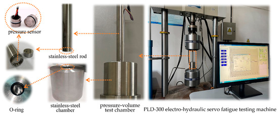 Figure 2 is a schematic diagram of the pressure–volume test bench for nanofluidic stuffing. A PLD-300 electro-hydraulic servo fatigue testing machine was used as loading–unloading equipment of force. The pressure–volume test chamber of nanofluidic stuffing was composed of a stainless-steel chamber and a stainless-steel rod. An O-ring was used to seal the stainless-steel chamber and the stainless-steel rod. The PLD-300 testing machine controlled experimental parameters such as loading–unloading rate and numbers of loading–unloading cycles and recorded the displacement of the stainless-steel rod. A pressure sensor was embedded at the bottom of the stainless-steel rod; thus, the pressure change in nanofluidic stuffing in the test chamber could be monitored. During the experiments, the PLD-300 testing machine pressed down the stainless-steel rod to compress the nanofluidic stuffing in the stainless-steel chamber. When the pressure in the test chamber reached 50 MPa, it retrieved the stainless-steel rod at the same speed. After going back to the initial position, it pressed down the stainless-steel rod again to compress the nanofluidic stuffing. When the pressure in the test chamber reached 50 MPa, it retrieved the stainless-steel rod again. This process was repeated for ten successive loading–unloading cycles.