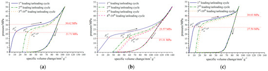 Pressure-specific volume curves of zeolite/water, zeolite/glycerin, and zeolite/saturated KCl solution stuffing (zeolite here refers to ZSM-5 zeolite, where zeolite and the functional liquid are blended according to 1 g to 10 mL): (a) zeolite/water stuffing; (b) zeolite/glycerin stuffing; (c) zeolite/saturated KCl solution stuffing.