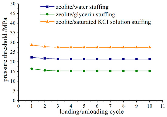 Pressure thresholds of the three kinds of zeolite-based stuffing under ten cyclic loadings (ZSM-5 zeolite/water stuffing, ZSM-5 zeolite/glycerin stuffing, and ZSM-5 zeolite/saturated KCl solution stuffing).