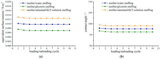 Equivalent surface tension and contact angle of three kinds of zeolite-based stuffing under ten cyclic loadings (ZSM-5 zeolite/water stuffing, ZSM-5 zeolite/glycerin stuffing, and ZSM-5 zeolite/saturated KCl solution stuffing): (a) equivalent surface tension; (b) contact angle.