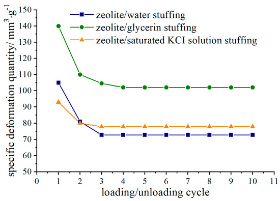 Specific deformation quantity of three kinds of zeolite-based stuffing under ten cyclic loadings (ZSM-5 zeolite/water stuffing, ZSM-5 zeolite/glycerin stuffing, and ZSM-5 zeolite/saturated KCl solution stuffing).