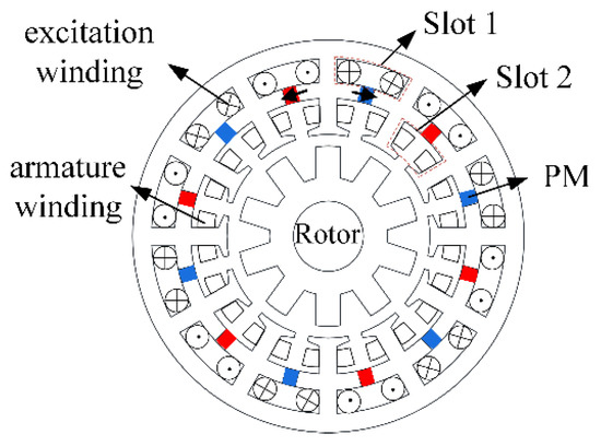 - The hybrid and parallel excitation approach of PMs and DC excitation windings, which is suitable for wide and high-speed range operating conditions, can achieve flux regulation, reduce excitation loss, and optimize efficiency.