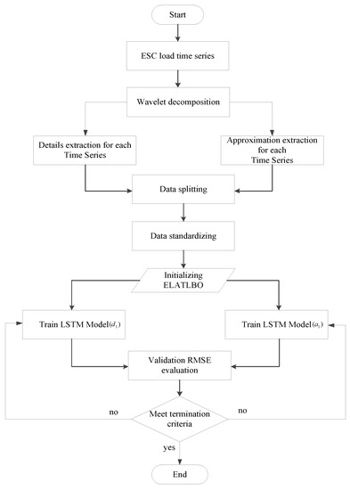 Secondly, decomposed vectors d1 and a1 will be standardized and ELATLBO method parameters will be initialized. In the next step, LSTM models will be trained using initial values of hyper-parameters with a lag of one hour. When the training step is completed validation data is used to produce validation predictions and the fitness function i.e., RMSE will be evaluated in the current iteration. The algorithm will continue until one of the terminations criteria will be met.