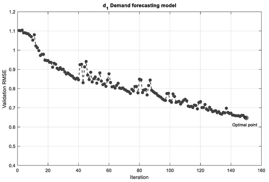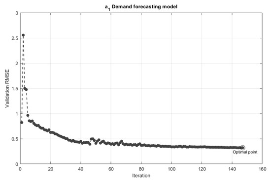 The process of minimizing validation RMSE for d1 and a1 forecasting models is illustrated in Figure 5 and Figure 6 respectively. The maximum number of runs of the ELATLBO is set at 150 and in each run, the LSTM training epochs are set to be between 100 to 500 in this study. Optimal hyper-parameters of LSTM obtained using the ELATLBO are presented in Table 2 and the prediction results are illustrated in Figure 7.