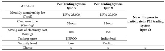 The attributes in the choice sets include monthly fee for P2P trading based on block chain system (Tariff), clearing time spent from transaction commitment of the P2P electricity trading until it is settled (Clearing), and the saving rate on electricity tariff due to the P2P trading (Saving). We also employed effect codes for the choice of a trading agent and security attributes, as they are categorical variables []. Categorical variables can take limited number of possible values. As an example, if an alternative included KEPCO as a trading agent, it was assigned an effect code of 1, and if the alternative included the individual consumer as a trading party, then the effect code was negative 1 (e_KEPCO). Similarly, the security variable has three values: low (1), medium (2), and high (3). Low_Security is an effect code for low security level, and High_Security is an effect code for high security level, where medium security level is set as a reference level. The Low_Security value is 1 if security level is low, zero if security level is high, and negative 1 for medium security level. Table 2 shows all possible attributes levels which can occur in the choice sets.