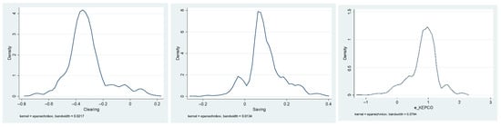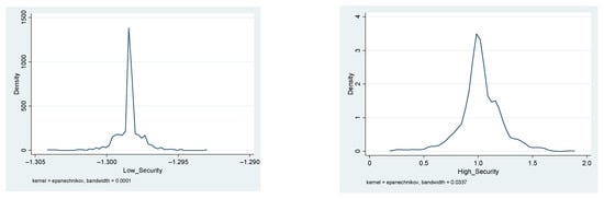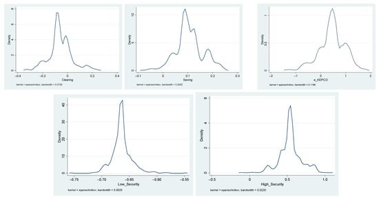 Although the MLM or hybrid models can detect if there is unobservable heterogeneity in respondents’ preferences, they cannot provide the distribution of the heterogeneity. Figure 4 provides the Kernel density distributions for the individual coefficients of Clearing, Saving, e_KEPCO, Low_Security, and High_Security based on our MLM estimation. Except for Low_Security, Kernel density distributions for Clearing, Saving, e_KEPCO, and High_Security display negative as well as positive values. However, a greater number of respondents prefers lower clearing times, higher saving rates, KEPCO as a trade agent, and high security levels. Kernel density distribution for Low_Security indicates that all the respondents have negative preferences for Low_Security.