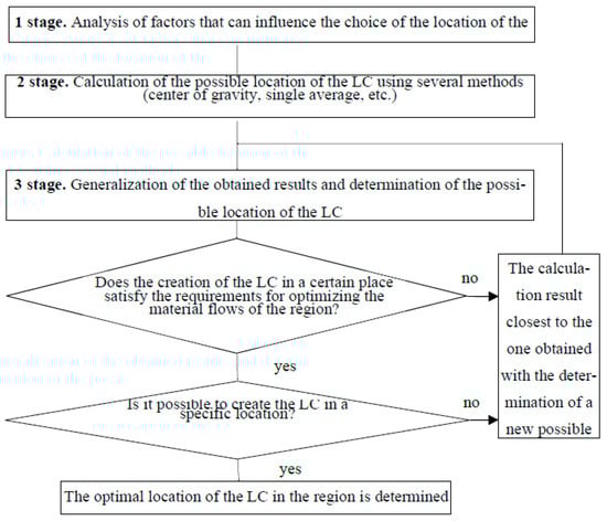 The creation of a regional LC is a complex process that requires a systematic approach, the involvement of qualified specialists, significant investments and taking into account the conditions of a specific region. Therefore, the determination of the location of the LC must be carried out in stages, moving from general decisions to partial ones. The following algorithm is proposed to verify the results of determining the location of an LC in the region (Figure 2). The target value in the model is the optimization of material flows in the region.