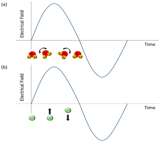 In general, the heating mechanisms of microwave energy consist of electric field heating and magnetic field heating, which are governed by different mechanisms. For electric field heating, there are two major mechanisms, namely dipolar polarization and ionic conduction, while the combination of these two mechanisms is interfacial polarization [15]. The dipolar polarization is a mechanism involves the rotation of polar molecules aligning themselves with microwave’s electric field, where the heat and friction were generated due to the continuous alignment of polar molecules as the electric field was regularly oscillating as shown in Figure 1. As for ionic conduction, the electric current is produced due to the oscillation of ions in forth and backward due to the electric force of microwaves. The produced current undergoes internal resistance, in which the collisions between the charged molecules with their neighboring molecules heat up the materials [16].