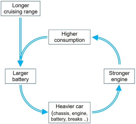 As batteries have a significantly lower energy density than petrol, methane or hydrogen tanks, a heavy battery will be needed for a long cruising range, which increases the weight of the car compared to other driving systems. This increased weight requires more robust and thus heavier components (chassis, brakes, etc.), which makes it even heavier (Figure 1). The increased vehicle weight also increases energy consumption and reduces performance in terms of range and acceleration.