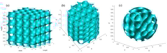TPMS created on the basis of the Schwartz diamond minimal surface in a limited space: (a) cuboid, (b) cylinder, (c) sphere.