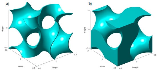 In Equations (1)–(7), the quantities x, y, z are the spatial coordinates and C is the constant. When the constant C takes the value C = 0, it means that the minimal surface thickness is 0, and thus, its volume is equal to 0 (Figure 1a), and the entire space is divided into two equal parts. When the constant C assumes the value of C ≠ 0, then the isosurfaces are separated [89] by a distance of 2C (+C and −C) (Figure 1b). Filling the space between isosurfaces with AM techniques is the basis for producing solids based on minimal surfaces.