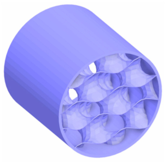 An element with the shape shown in Figure 7 was used as an insertion into the pipeline to improve the mixing of the flowing medium [120]. Using the CFD simulation, the influence of the insert (gyroid TPMS with 10 different porosities) on the fluid flow resistance and heat transfer from the insert to the flowing fluid was investigated. ANSYS Fluent was used for carrying out simulations. The ten different dimensions of the gyroid variants had large contact surfaces with the fluid despite their small dimensions. In the best design variant, the number of Nu was increased by 343% compared to the empty pipe.