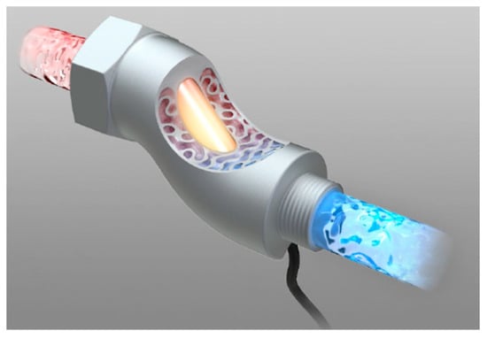 Paper [125] presents the concept of a water heater connected to a washing machine. An electric heater is placed in a specially shaped elbow (Figure 8) with an internal structure of a TPMS (gyroid), which is a developed heat exchange surface and a water flow turbulizer. The authors emphasize the high efficiency of the implemented construction solution.