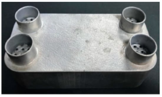 A new method of designing TPMS-based heat exchangers with virtually any channel structure was presented in [47]. Designing enables the use of the obtained models for both CFD simulation and 3D printing. Examples of proposals of various possible design solutions proposed by the authors are listed in Table 2. Additionally, the authors printed monolithic aluminum heat exchangers (Figure 10) with dimensions of 150 × 75 × 60 mm for four different filling options: a traditional plate and a TPMS that is 16 × 8 × 4 with a structure of primitive, gyroid, or diamond. The flow resistance and overall heat transfer coefficient of the exchanger during the flow of hot (40 °C) and cold (17.5 °C) water in the amount of 0.06 ÷ 0.15 kg/s were determined. It has been shown that the heat exchangers based on TPMSs are similar to each other in terms of thermal efficiency and are characterized by a higher overall heat transfer coefficient in relation to the plate exchanger. For the diamond structure, it was even 100% higher.