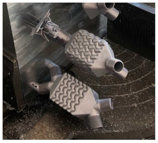 Powder bed fusion (PBF) is an additive manufacturing method that selectively heats the material powder with a laser beam or electrons [37]. The powder is fed in a controlled thickness layer by layer and fills the successive print planes. The powder is cured only at the point where the workpiece is formed, and the remainder of the powder can support inclined or horizontal surfaces that would normally require the construction of temporary support structures. Removal of the supporting structures from the confined space (e.g., limited by the walls of the exchanger) is practically impossible. The advantage of the method is that the removal of the remaining loose powder filling the voids is not a problem. Depending on the heat source (light beam, electron beam), two subgroups of solutions are distinguished: laser PBF (L-PBF) and electron beam PBF (EB-PBF) [38]. Selective laser sintering (SLS), selective laser melting (SLM), electron beam melting (EBM), and direct metal laser sintering (DMLS) are the elementary AM techniques included in the PBF method. In the former PBF technology, the working material is usually a polymer, and in the latter, a metal [39].