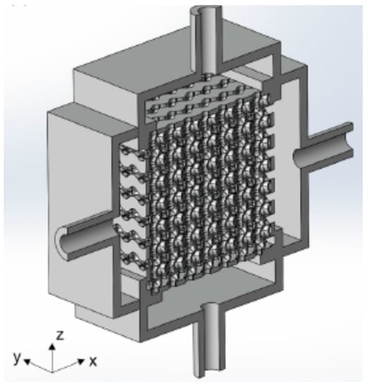 The shell-and-tube heat exchanger (Figure 11) was the subject of research by the authors of [130]. The dimensions of the specific heat exchange zone were 50 mm × 50 mm. Water flow (0.0083 ÷ 0.15 kg/s) took place through channels formed by gyroid and diamond structures. The base TPMS cell was sized to flow through eight interleaved channels. Since similar thermal parameters of the heat exchange process were obtained, it was assumed that the diamond structure (due to simpler modeling) was more suitable for the production of heat exchangers by hypertrophic methods, although the gyroid was characterized by slightly higher values of the ratio of exchanged heat to flow resistance.