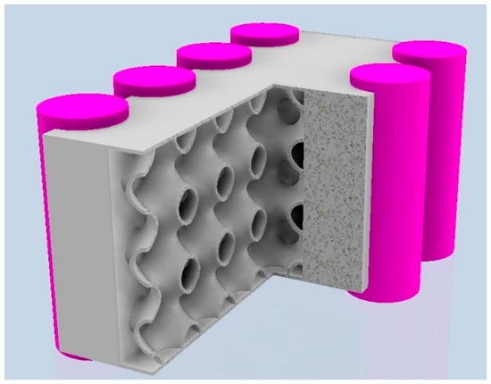 The 3D model of the crosscurrent heat exchanger with inlet channels adapted to the shape of the TPMS used (gyroid and diamond, 2 × 2 × 2) was subjected to numerical tests to assess the values of: flow resistance, heat transfer coefficient, and temperature changes of the flowing medium [128]. Hot (T = 82 °C) and cold (T = 27 °C) water flowed through the exchanger in the amount of 0.00092–0.023 kg/s. It was found that by assuming that the heat exchanger is made of aluminum alloy AlSi10Mg, the highest heat transfer coefficient (1413 W/(m2 K)) was obtained for the diamond structure.