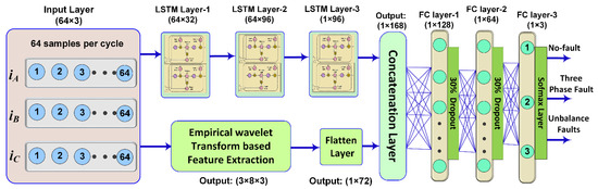 where FDTm denotes the output status of the mth fault type. The FTD unit employs three LSTM layers for temporal feature extraction and EWT for statistical feature extraction from the three-phase current signal. Among the three LSTM layers, the first layer maps the time-domain current signal into higher dimension space, whereas the next two layers are used to extract the long and short-term temporal dependencies. These LSTM layers are constructed using LSTM memory units. The dimensions of the layers are selected based on the number of input samples and the number of hidden neurons. After extracting features, a depth concatenation layer is used to combine LSTM-based features with EWT-based features. Afterwards, the features are abstracted by three FC layers. The number of hidden neurons in the first two FC layers is selected by performing extensive simulations, whereas the three hidden neurons are used in the last FC layer (which corresponds to three outputs). To avoid the risk of over-fitting, a dropout layer is employed after the first two FC layers, which exclude some features (30% in this study). The excluded features do not contribute to the output estimation. Lastly, a Softmax layer is used, which provides the most probable fault type at the output.