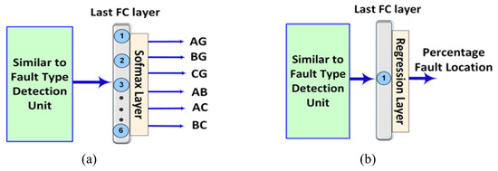 To reduce the blackout time and to increase the system repair, the precise location of the fault is important. The fault location estimation unit is developed to obtain the exact fault location in the proposed NIPS. This unit is triggered only if the fault type detection unit detects a three-phase or unbalanced fault in a MG. The fault location estimation unit also has a similar structure to that of the fault type detection unit except for the last FC layer and Softmax layer. The modified structure is shown in Figure 6b. The last FC layer in this unit has only one neuron as the regression layer relates the input data sample to continuous value. The objective function to be optimized during the training process of a network with a regression layer is the mean square error (MSE). The MSE can be calculated by using the following equation:
