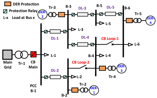 To authenticate the efficacy of the proposed NIPS, several fault and non-fault conditions are investigated on IEC MG. The single-line diagram of the IEC MG is shown in Figure 7. The network and load-related data have been taken [32]. The nominal voltage of the system is 25 kV. The system integrates two CIDERs at buses B-4 and B-6 and two SBDERs at buses B-2 and B-3 by using step-up transformers. Three circuit breakers are used to create different working scenarios in the MG.