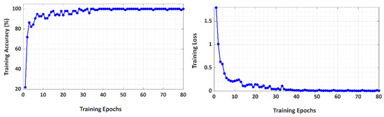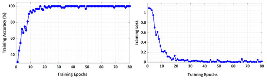 The two datasets obtained by simulation various fault and non-fault conditions were employed to train and test the LSTM network of the FTD unit. In the training phase, 10,080 samples of unbalanced faults, 1120 samples of three-phase faults, and 230 samples of no-fault (NF) were used. To remove the bias in the input samples, the non-fault samples and three-phase fault samples were replicated. The bias and weights of the structure were trained using the Adam optimization approach with a mini-batch size of 64. The percentage loss and accuracy during the training process of the fault type detection unit are shown in Figure 8. The figure shows that the training process converged fast within 23 epochs.