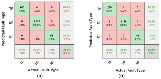 Confusion matrices of the testing dataset for FTD unit during: (a) grid-tied mode and (b) islanded mode.
