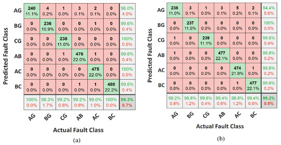Confusion matrices of the testing dataset for fault classification unit during: (a) grid-tied mode; (b) islanded mode.