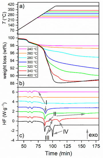 - Between 320 and 340 °C, the reaction step II was completed, and two new reactions corresponding to the thermal events III and IV occurred where the latter one was incomplete. The reaction step IV was completed during the decomposition at 400 °C. Thus, yet another and different reaction products can be expected after the decomposition after 340 and 400 °C.