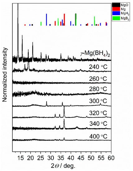 The powder X-ray diffraction patterns of the starting and decomposed samples, recorded ex situ, are shown in Figure 2. The results reveal the absolute prevalence of γ-Mg(BH4)2 in the starting material, presence of ht-Mg(BH4)2 after the 240 °C isotherm [20], but no crystalline phases after decomposition at 260 °C. MgH2 appeared at 300 °C, though traces can be distinguished already after 280 °C, and decomposed into Mg after 320 and 340 °C. In addition, MgO was observed in the patterns of the samples treated at and above 320 °C. A broad background that might be related to amorphous phases was observed in some of the patterns.