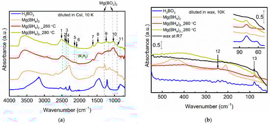 In the far-IR spectrum of Mg(BH4)2 (Figure 3b, orange curve), only the weak feature at 79 cm−1 is similar to the one in H3BO3. Other peaks are similar to those reported earlier [18]. It can be mentioned that most of the measurements on borohydrides and similar compounds reported in the literature have been performed using attenuated total reflection (ATR) sampling, a method where no sample dilution is required. In this study, the samples were measured in the transmission mode, diluted in CsI or wax, and thus, the effect from the matrix can be expected in the spectra in addition to a slight shift of the peaks and slightly different intensity ratios between higher-energy and lower-energy modes [34]. For example, the broad absorptions at 3600–3300 with 1620 cm−1 (water) and the weak peaks at ca. 2900 cm−1 (C-H bonds of organics) are most probably related to the impurities in the matrix.