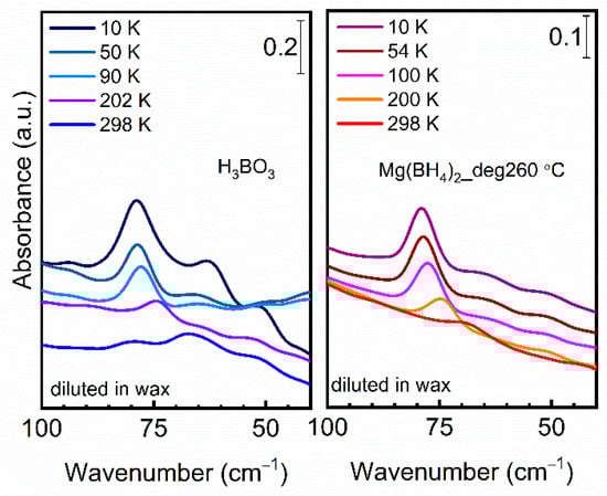 Temperature dependence of the far-IR spectra in the RT-10 K for the reference H3BO3 (left) and the Mg(BH4)2 decomposed at 260 °C (right).