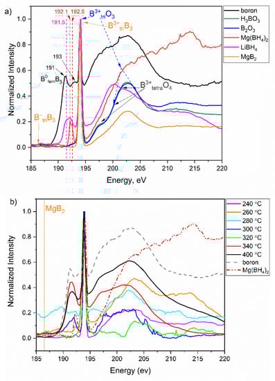 Figure 5b shows NEXAFS spectra of decomposed Mg(BH4)2. One can immediately note that all the spectra demonstrate peaks due to boron oxides with planar anions evidencing sample oxidation.